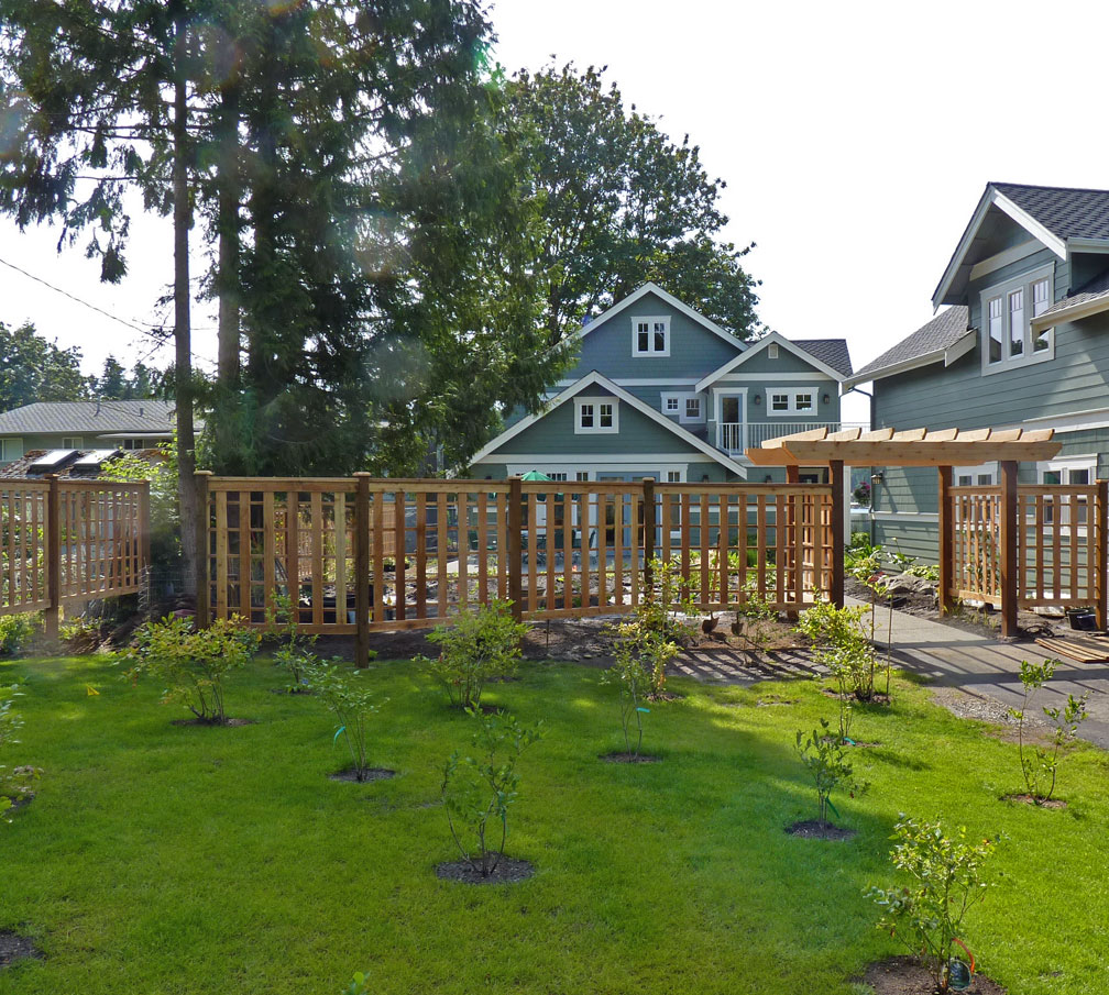 After the trellis was in, Jay transplanted 19 blueberries plants to the area outside the fence. I started a Kiwi up one side of the arbor and a Honeysuckle up the other side. Other climbing plants to come. If you need a similar fence or arbor, call Jonelle at Lattice Top Fence Co. They are great!